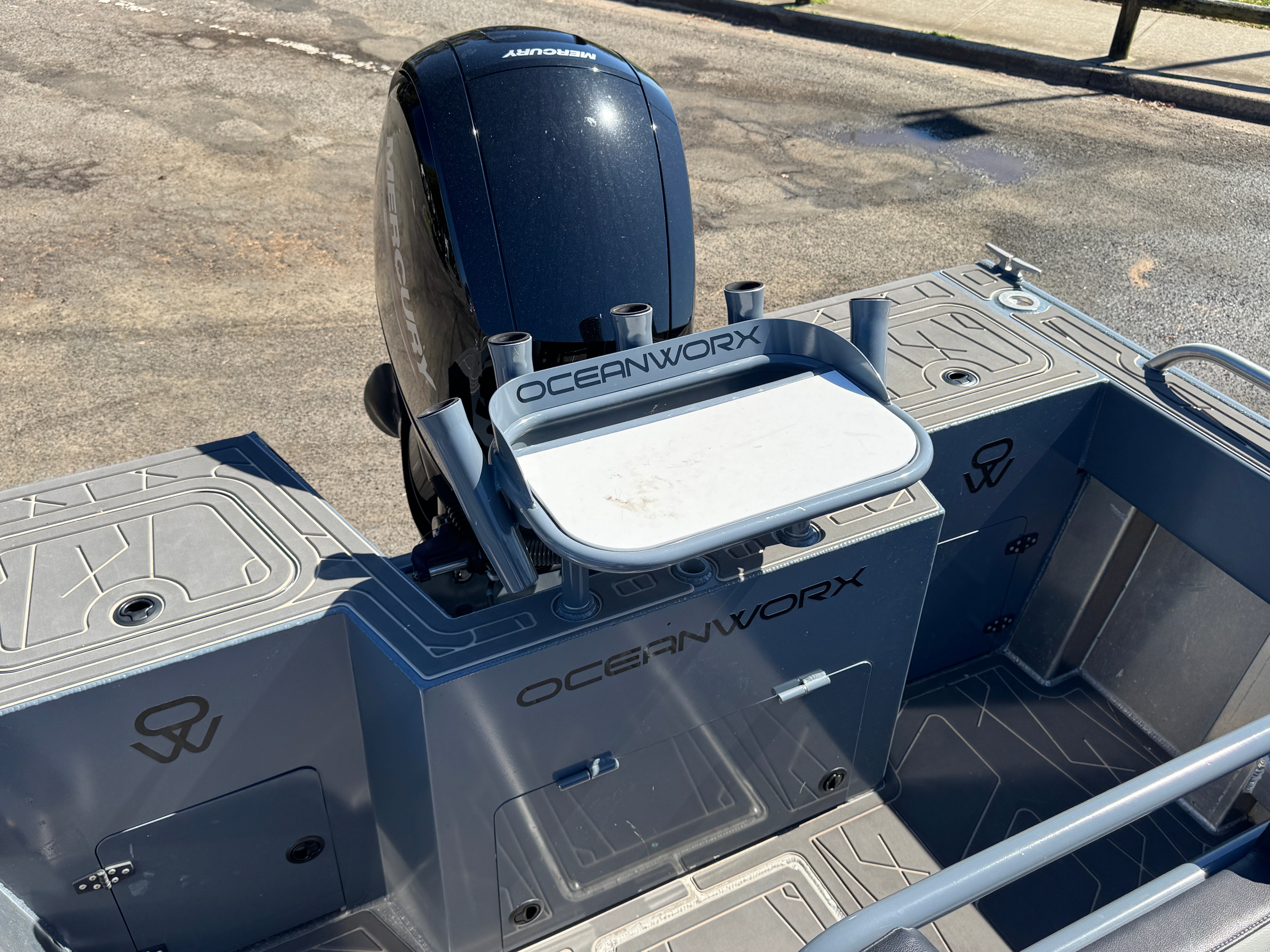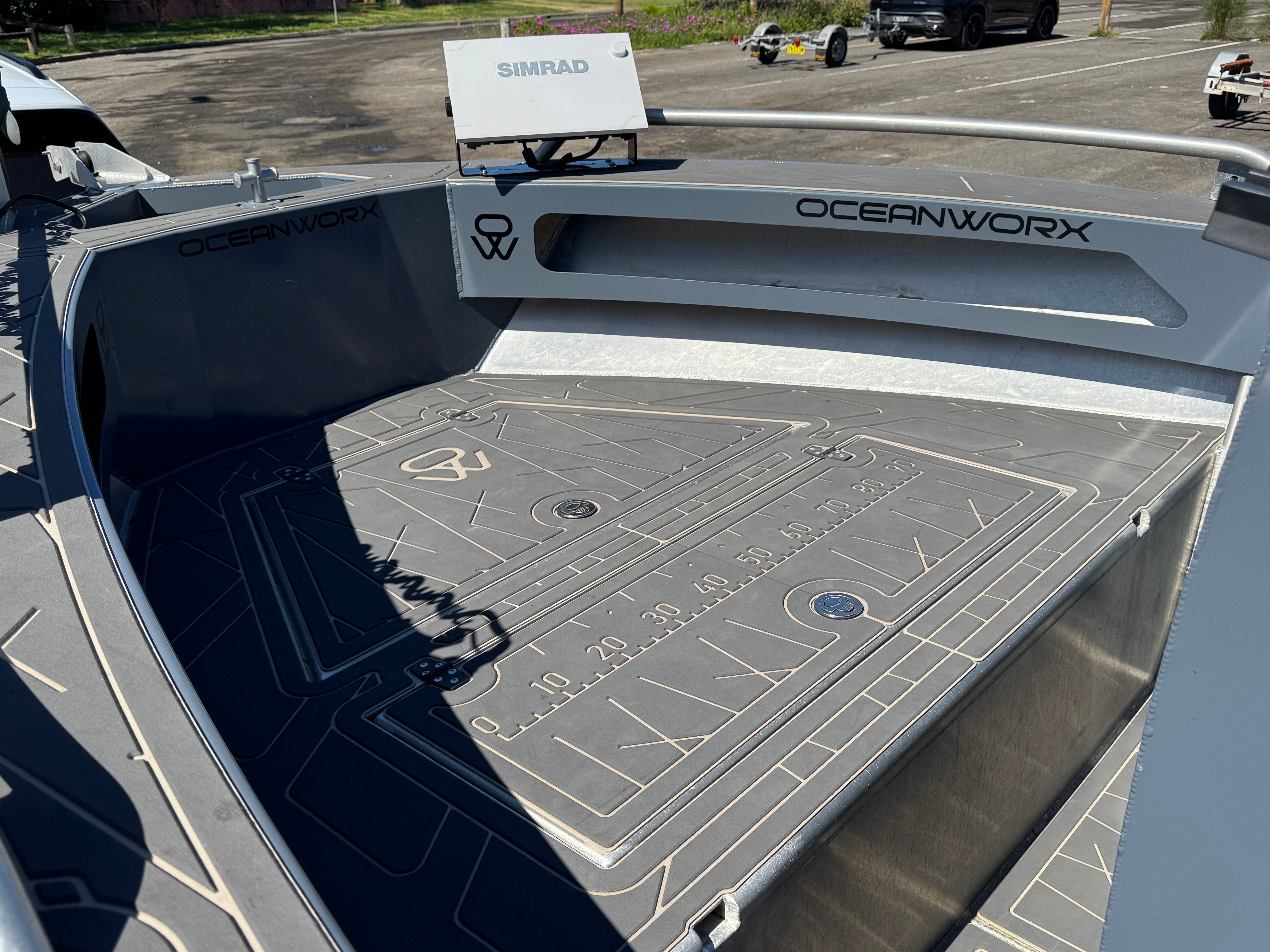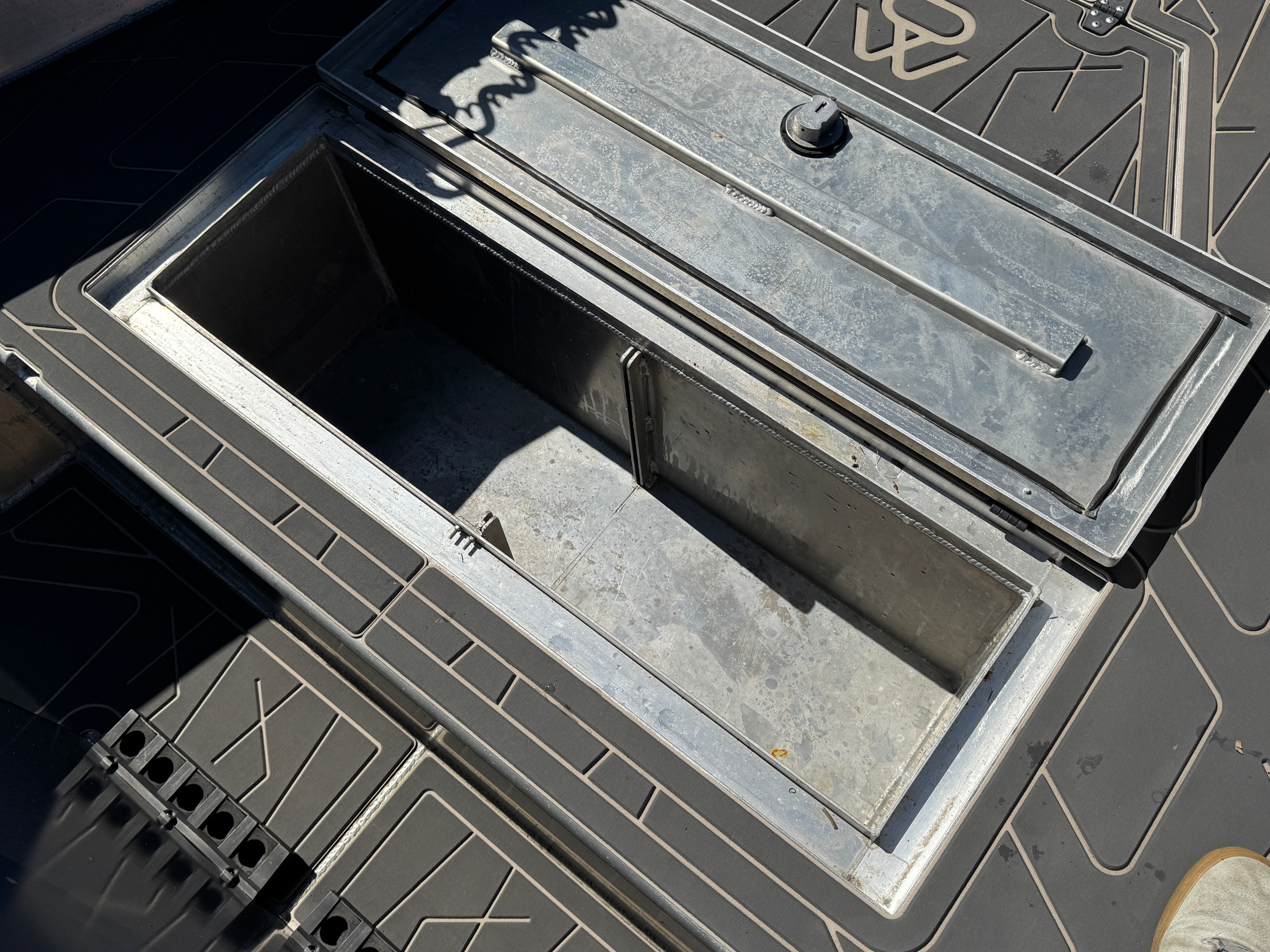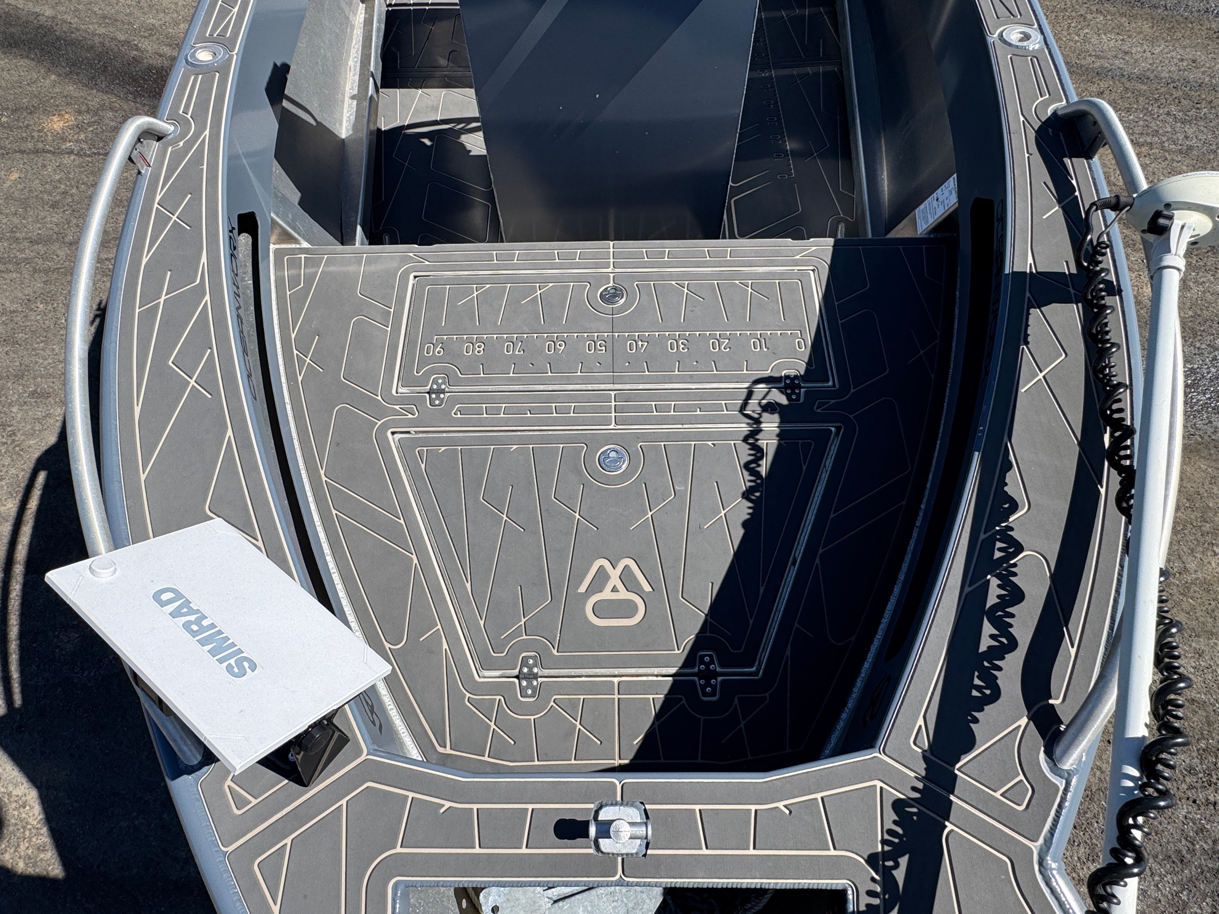 Enclosed transom, dual plumbed live bait tanks, removable bait board, U deck flooring, U deck side decks, Simrad 16" EVO 3s sounder, Simrad EVO 3s 12" sounder, mapping card, 1 kw HW through hull transducer, active 3n1 transducer, Motorguide 80lb 24v electric motor, 100ah Lithium 24v battery for electric and Roswell stereo.